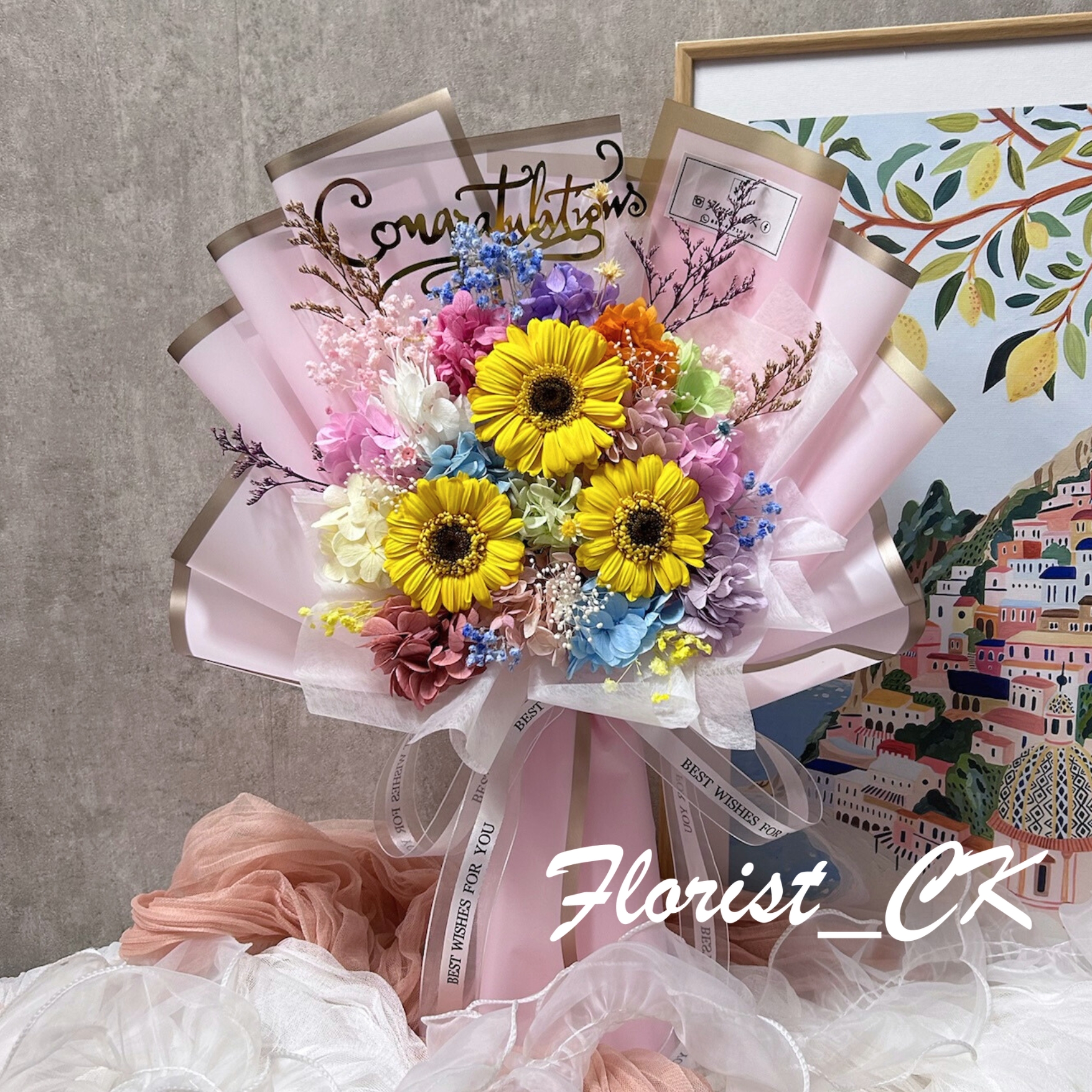 Rainbow 金邊粉紅花紙款|畢業之選|永生太陽花花束 (預訂款)